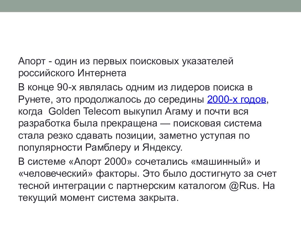 Апорт - один из первых поисковых указателей российского Интернета В конце 90-х являлась одним из лидеров поиска в Рунете, это продолжалось до середины 2000-х годов, когда Golden Telecom выкупил Агаму и почти вся разработка была прекращена — поисковая система стала резко сдавать позиции, заметно уступая по популярности Рамблеру и Яндексу. В системе «Апорт 2000» сочетались «машинный» и «человеческий» факторы. Это было достигнуто за счет тесной интеграции с партнерским каталогом @ Rus. На текущий момент система закрыта.