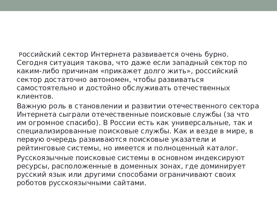 Р оссийский сектор Интернета развивается очень бурно. Сегодня ситуация такова, что даже если западный сектор по каким-либо причинам «прикажет долго жить», российский сектор достаточно автономен, чтобы развиваться самостоятельно и достойно обслуживать отечественных клиентов. Важную роль в становлении и развитии отечественного сектора Интернета сыграли отечественные поисковые службы (за что им огромное спасибо). В России есть как универсальные, так и специализированные поисковые службы. Как и везде в мире, в первую очередь развиваются поисковые указатели и рейтинговые системы, но имеется и полноценный каталог. Русскоязычные поисковые системы в основном индексируют ресурсы, расположенные в доменных зонах, где доминирует русский язык или другими способами ограничивают своих роботов русскоязычными сайтами.