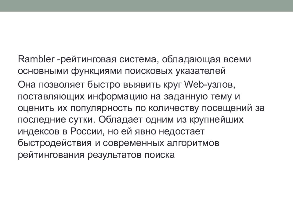 Rambler - рейтинговая система, обладающая всеми основными функциями поисковых указателей Она позволяет быстро выявить круг Web -узлов, поставляющих информацию на заданную тему и оценить их популярность по количеству посещений за последние сутки. Обладает одним из крупнейших индексов в России, но ей явно недостает быстродействия и современных алгоритмов рейтингования результатов поиска