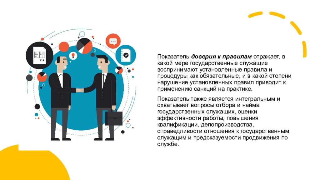 Показатель доверия к правилам отражает, в какой мере государственные служащие воспринимают установленные правила и процедуры как обязательные, и в какой степени нарушение установленных правил приводит к применению санкций на практике. Показатель также является интегральным и охватывает вопросы отбора и найма государственных служащих, оценки эффективности работы, повышения квалификации, делопроизводства, справедливости отношения к государственным служащим и предсказуемости продвижения по службе.