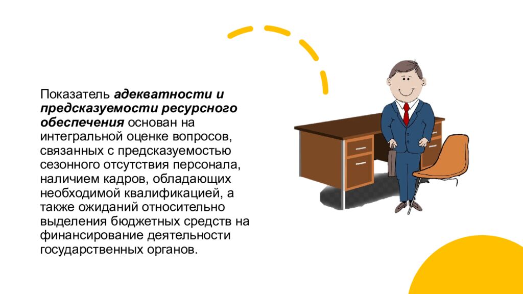 Показатель адекватности и предсказуемости ресурсного обеспечения основан на интегральной оценке вопросов, связанных с предсказуемостью сезонного отсутствия персонала, наличием кадров, обладающих необходимой квалификацией, а также ожиданий относительно выделения бюджетных средств на финансирование деятельности государственных органов.
