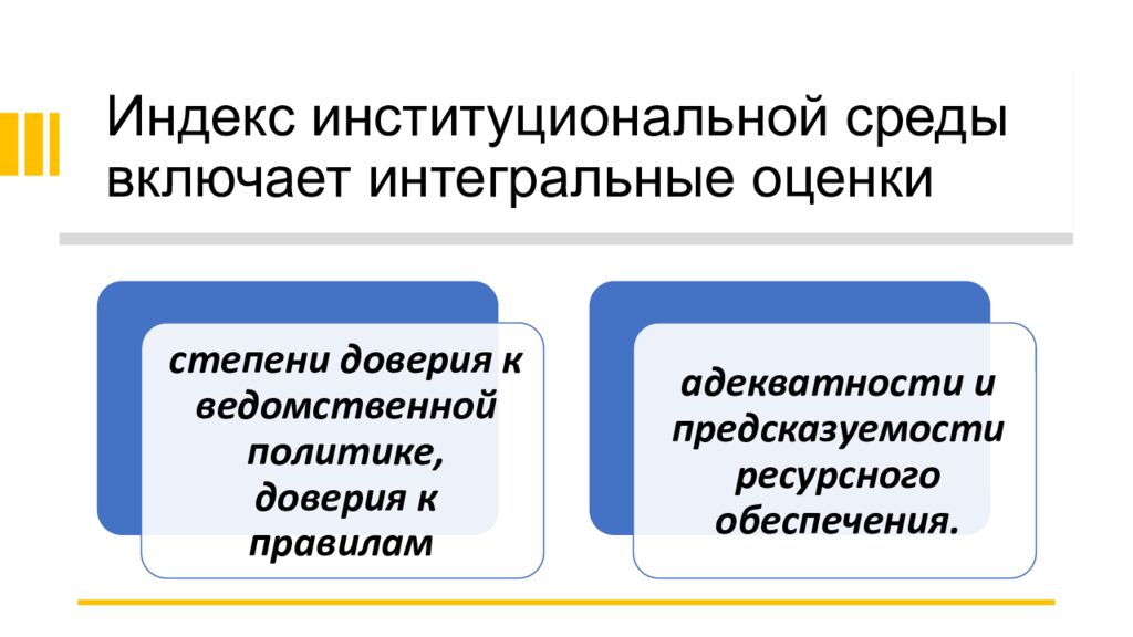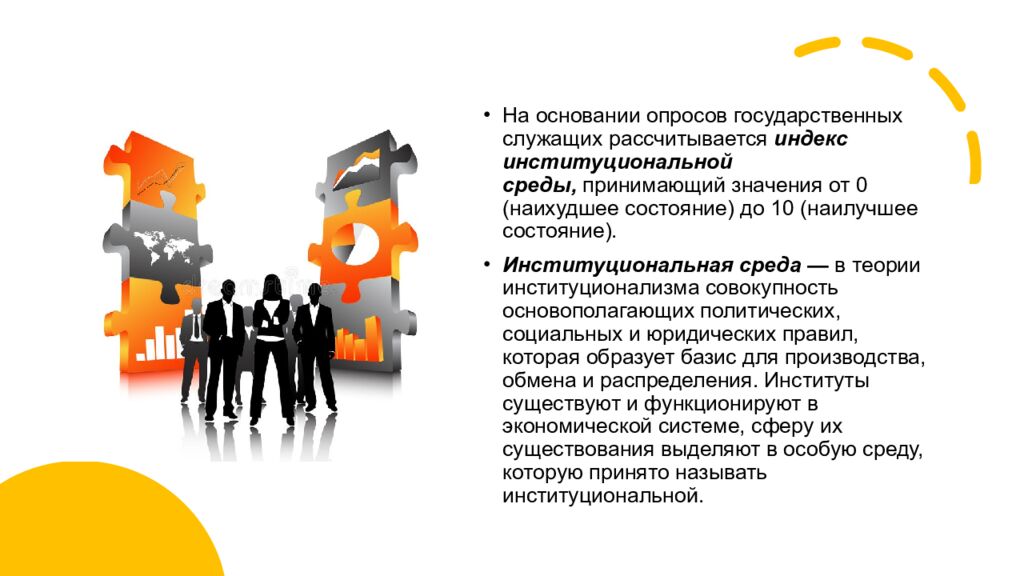 На основании опросов государственных служащих рассчитывается индекс институциональной среды, принимающий значения от 0 (наихудшее состояние) до 10 (наилучшее состояние). Институциональная среда — в теории институционализма совокупность основополагающих политических, социальных и юридических правил, которая образует базис для производства, обмена и распределения. Институты существуют и функционируют в экономической системе, сферу их существования выделяют в особую среду, которую принято называть институциональной.