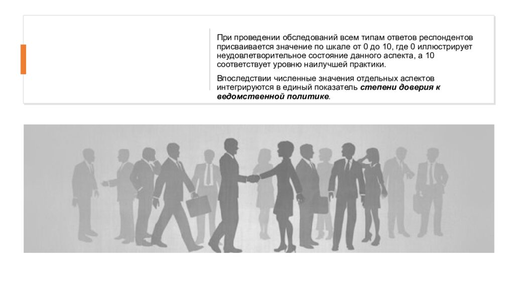 При проведении обследований всем типам ответов респондентов присваивается значение по шкале от 0 до 10, где 0 иллюстрирует неудовлетворительное состояние данного аспекта, а 10 соответствует уровню наилучшей практики. Впоследствии численные значения отдельных аспектов интегрируются в единый показатель степени доверия к ведомственной политике.