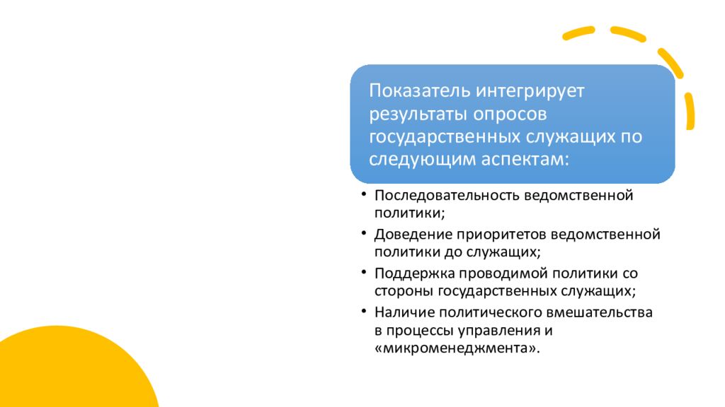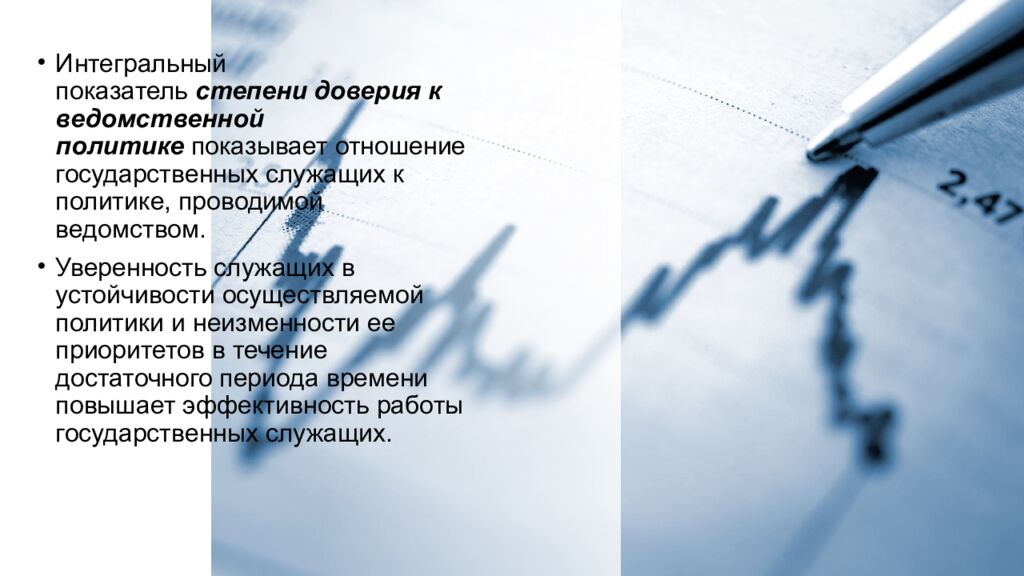 Интегральный показатель степени доверия к ведомственной политике показывает отношение государственных служащих к политике, проводимой ведомством. Уверенность служащих в устойчивости осуществляемой политики и неизменности ее приоритетов в течение достаточного периода времени повышает эффективность работы государственных служащих.