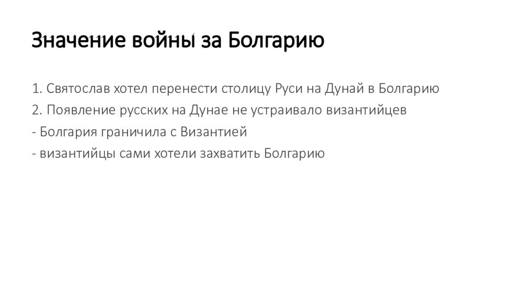 1. Святослав хотел перенести столицу Руси на Дунай в Болгарию 2. Появление русских на Дунае не устраивало византийцев - Болгария граничила с Византией - византийцы сами хотели захватить Болгарию