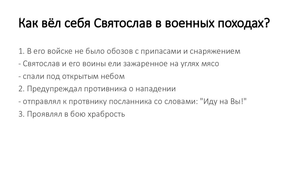 Слайд 9: Как вёл себя Святослав в военных походах ?