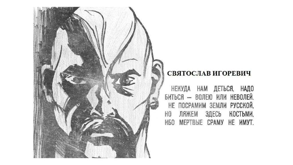 Когда же русские увидели их ( византийцев ) — сильно испугались такого великого множества воинов, но сказал Святослав : « Нам некуда уже деться, хотим мы или не хотим — должны сражаться. Так не посрамим земли Русской, но ляжем здесь костьми, ибо мертвым не ведом позор. Если же побежим — позор нам будет. Так не побежим же, но станем крепко, а я пойду впереди вас : если моя голова ляжет, то о своих сами позаботьтесь ». И ответили воины : « Где твоя голова ляжет, там и свои головы сложим ». И исполнились русские, и была жестокая сеча, и одолел Святослав, а греки бежали.