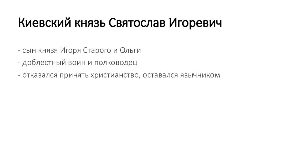 - сын князя Игоря Старого и Ольги - доблестный воин и полководец - отказался принять христианство, оставался язычником