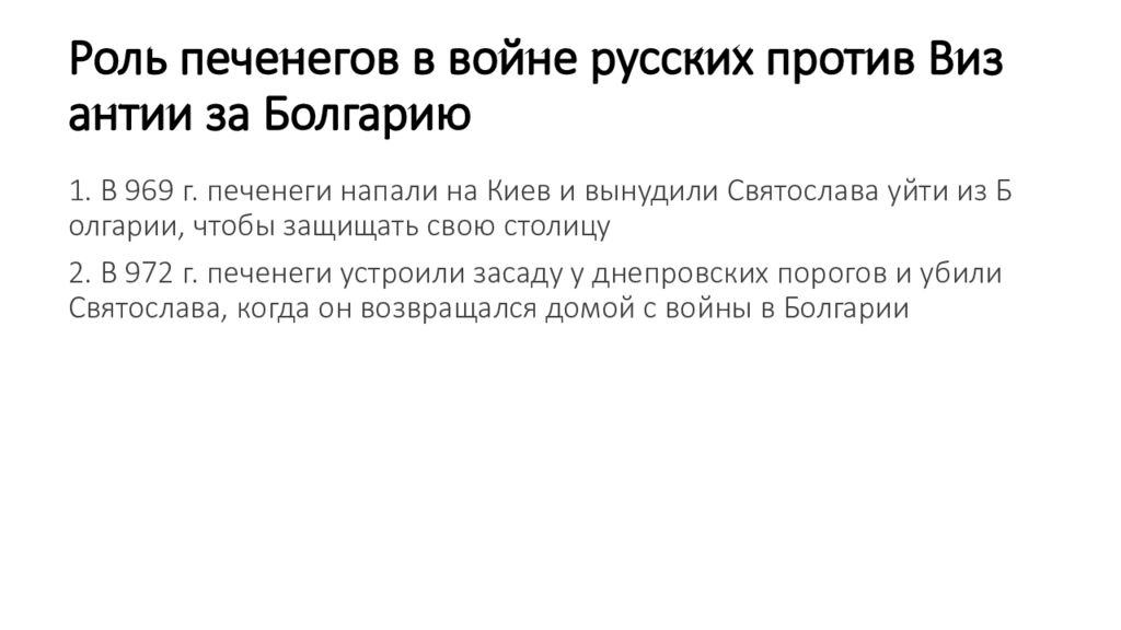 1. В 969 г. печенеги напали на Киев и вынудили Святослава уйти из Болгарии, чтобы защищать свою столицу 2. В 972 г. печенеги устроили засаду у днепровских порогов и убили Святослава, когда он возвращался домой с войны в Болгарии