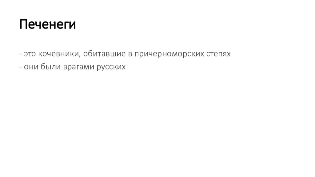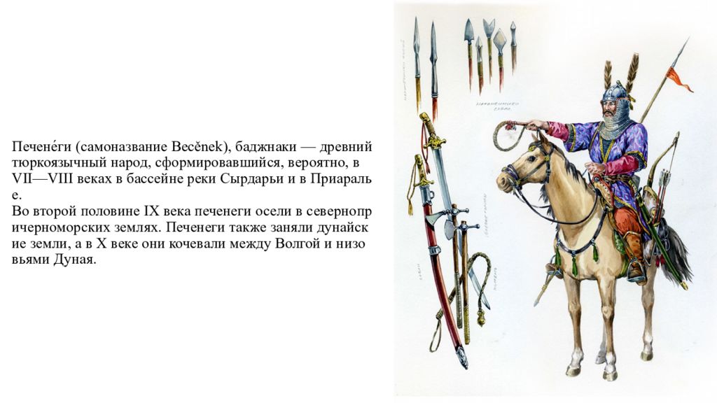 Слайд 25: Печене́ги ( самоназвание Bec ě nek), баджнаки — древний тюркоязычный народ, сформировавшийся, вероятно, в VII—VIII веках в бассейне реки Сырдарьи и в Приаралье. Во второй половине IX века печенеги осели в севернопричерноморских землях. Печенеги также заняли дунайские земли, а в X веке они кочевали между Волгой и низовьями Дуная