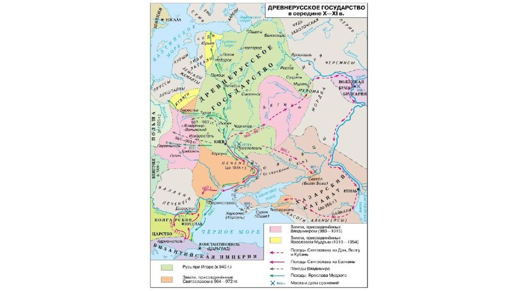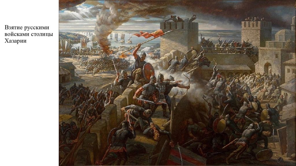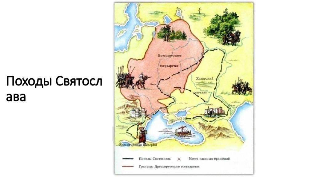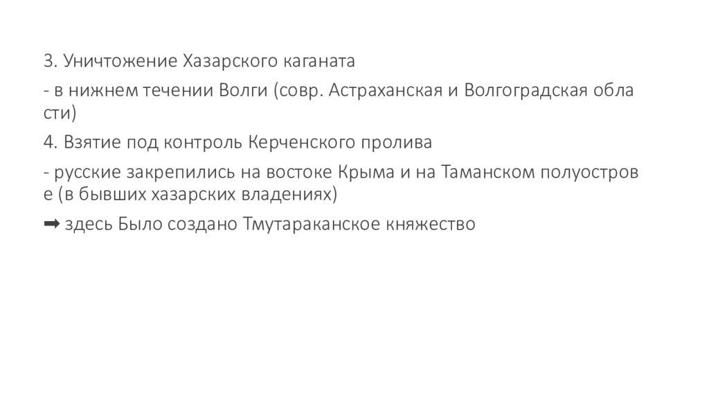 3. Уничтожение Хазарского каганата - в нижнем течении Волги ( совр. Астраханская и Волгоградская области ) 4. Взятие под контроль Керченского пролива - русские закрепились на востоке Крыма и на Таманском полуострове ( в бывших хазарских владениях ) ➡ здесь Было создано Тмутараканское княжество