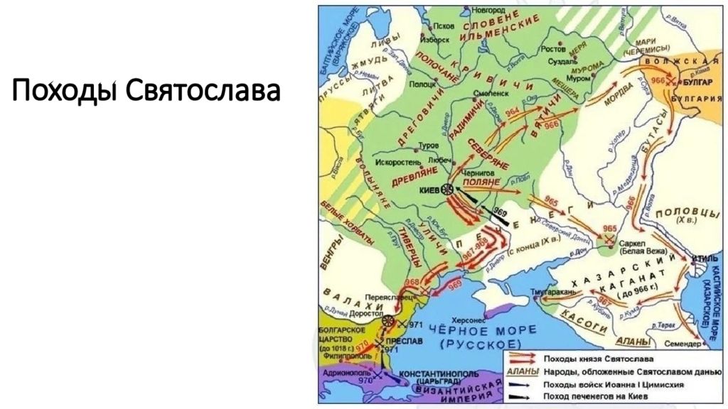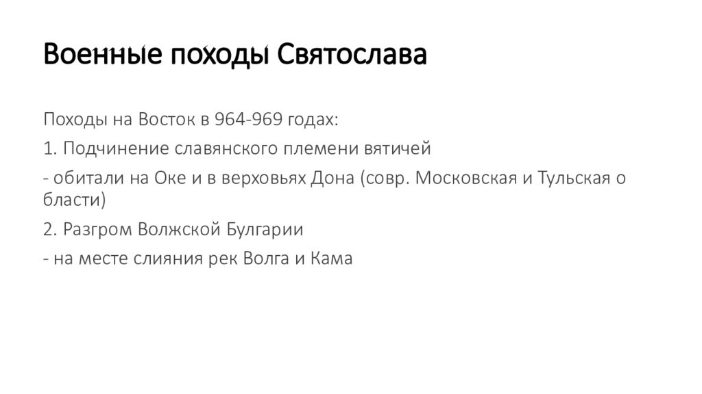 Походы на Восток в 964-969 годах : 1. Подчинение славянского племени вятичей - обитали на Оке и в верховьях Дона ( совр. Московская и Тульская области ) 2. Разгром Волжской Булгарии - на месте слияния рек Волга и Кама