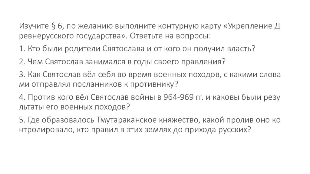 Изучите § 6, по желанию выполните контурную карту «Укрепление Древнерусского государства». Ответьте на вопросы : 1. Кто были родители Святослава и от кого он получил власть ? 2. Чем Святослав занимался в годы своего правления ? 3. Как Святослав вёл себя во время военных походов, с какими словами отправлял посланников к противнику ? 4. Против кого вёл Святослав войны в 964-969 гг. и каковы были результаты его военных походов ? 5. Где образовалось Тмутараканское княжество, какой пролив оно контролировало, кто правил в этих землях до прихода русских ?