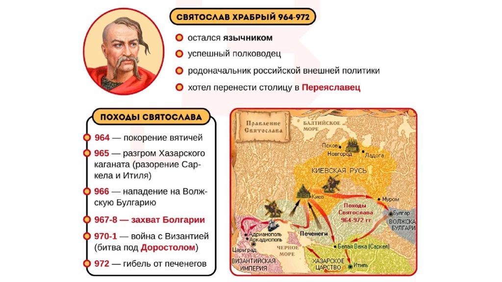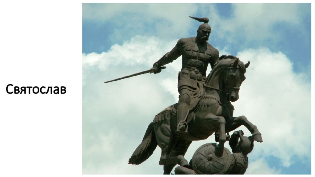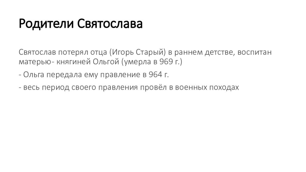 Святослав п отерял отца (Игорь Старый) в раннем детстве, воспитан матерью - княгиней Ольгой ( умерла в 969 г.) - Ольга передала ему правление в 964 г. - весь период своего правления провёл в военных походах