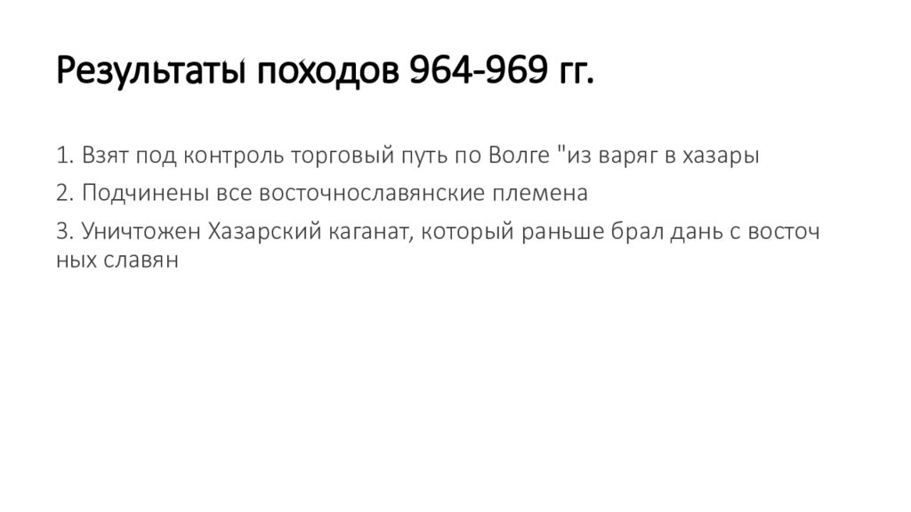 1. Взят под контроль торговый путь по Волге " из варяг в хазары 2. Подчинены все восточнославянские племена 3. Уничтожен Хазарский каганат, который раньше брал дань с восточных славян