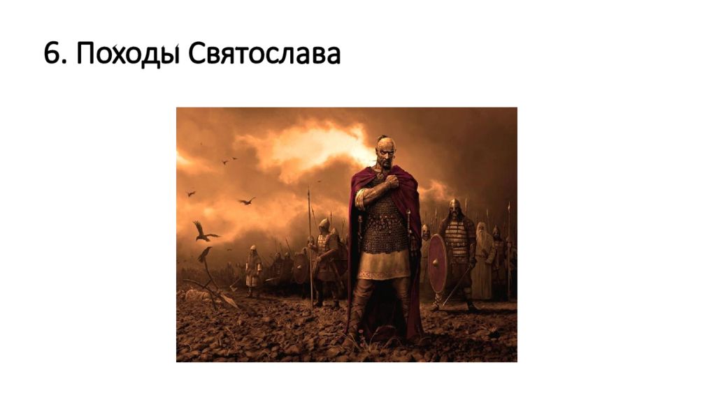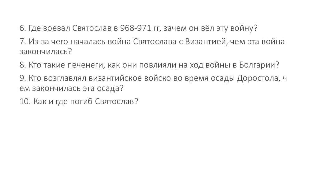 6. Где воевал Святослав в 968-971 гг, зачем он вёл эту войну ? 7. Из - за чего началась война Святослава с Византией, чем эта война закончилась ? 8. Кто такие печенеги, как они повлияли на ход войны в Болгарии ? 9. Кто возглавлял византийское войско во время осады Доростола, чем закончилась эта осада ? 10. Как и где погиб Святослав ?