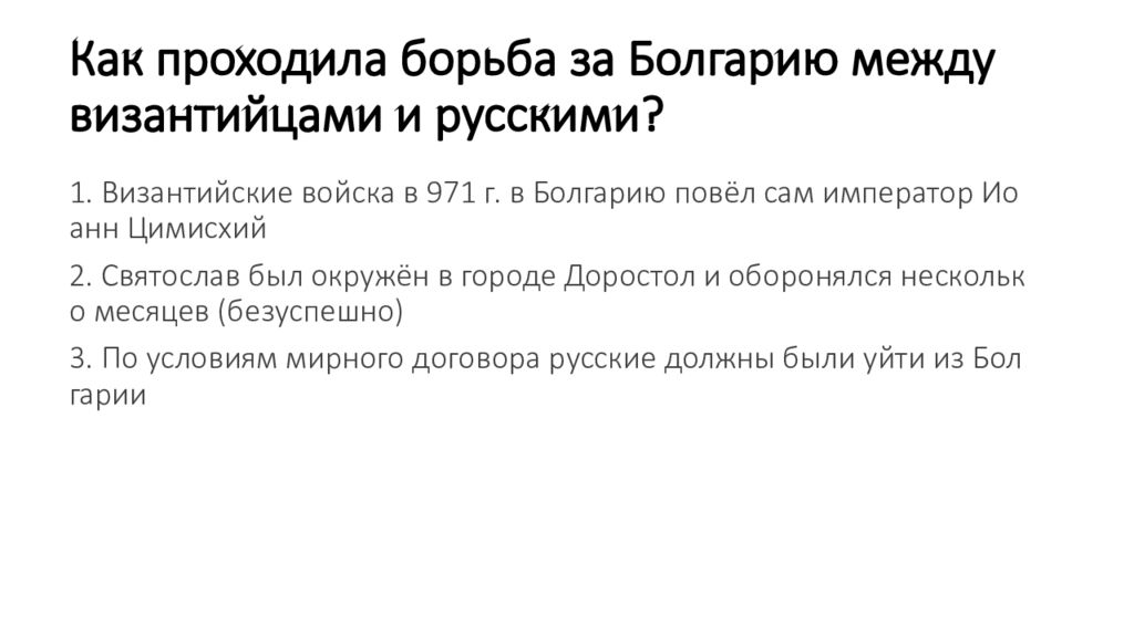1. Византийские войска в 971 г. в Болгарию повёл сам император Иоанн Цимисхий 2. Святослав был окружён в городе Доростол и оборонялся несколько месяцев ( безуспешно ) 3. По условиям мирного договора русские должны были уйти из Болгарии