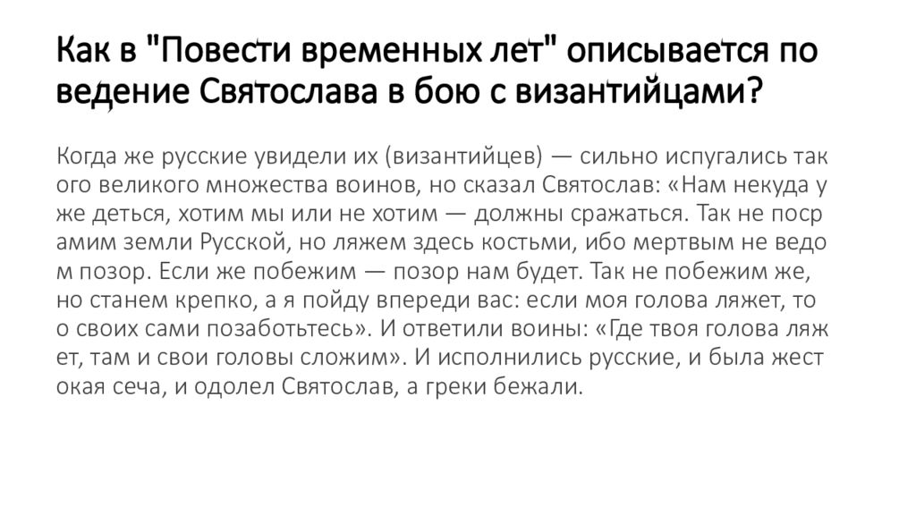Слайд 29: Как в " Повести временных лет " описывается поведение Святослава в бою с византийцами ?