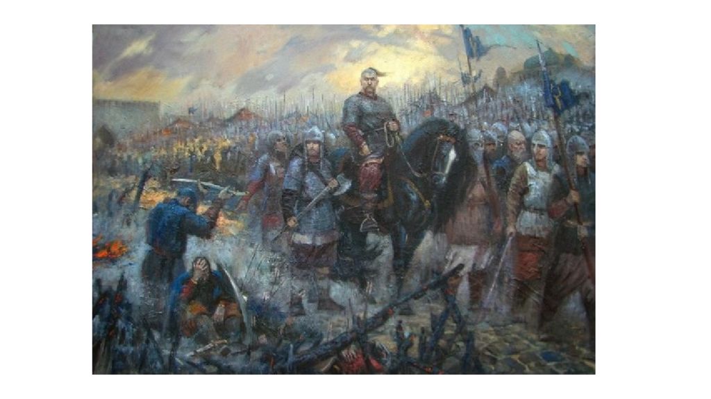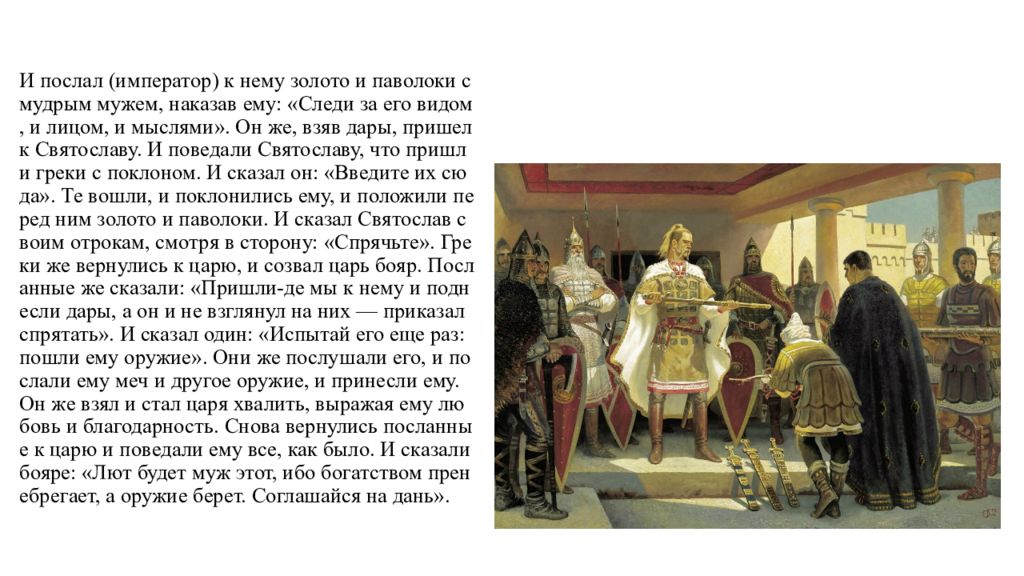 Слайд 23: И послал (император) к нему золото и паволоки с мудрым мужем, наказав ему : « Следи за его видом, и лицом, и мыслями ». Он же, взяв дары, пришел к Святославу. И поведали Святославу, что пришли греки с поклоном. И сказал он : « Введите их сюда ». Те вошли, и поклонились ему, и положили перед ним золото и паволоки. И сказал Святослав своим отрокам, смотря в сторону : « Спрячьте ». Греки же вернулись к царю, и созвал царь бояр. Посланные же сказали : « Пришли - де мы к нему и поднесли дары, а он и не взглянул на них — приказал спрятать ». И сказал один : « Испытай его еще раз : пошли ему оружие ». Они же послушали его, и послали ему меч и другое оружие, и принесли ему. Он же взял и стал царя хвалить, выражая ему любовь и благодарность. Снова вернулись посланные к царю и поведали ему все, как было. И сказали бояре : « Лют будет муж этот, ибо богатством пренебрегает, а оружие берет. Соглашайся на дань »