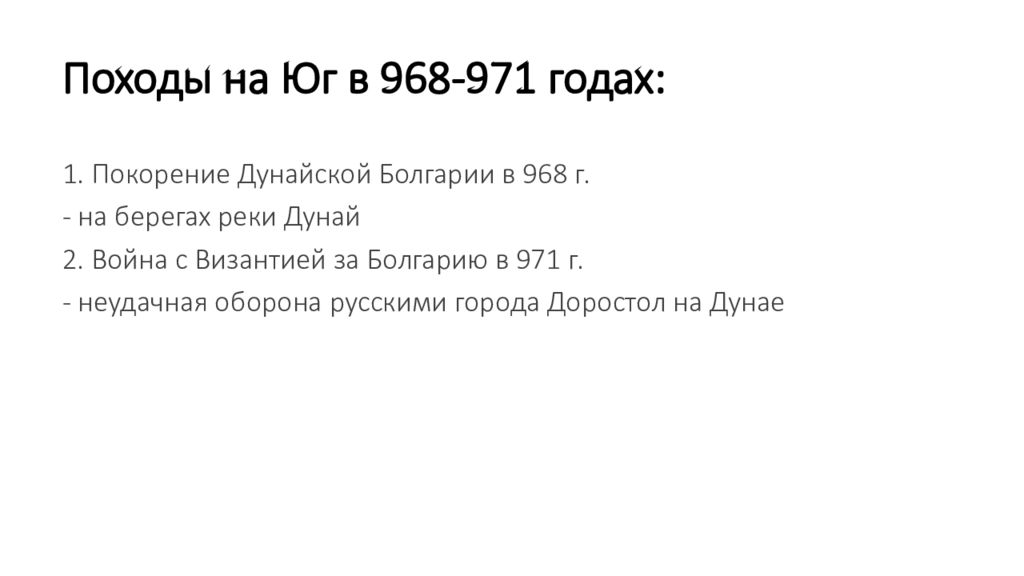 1. Покорение Дунайской Болгарии в 968 г. - на берегах реки Дунай 2. Война с Византией за Болгарию в 971 г. - неудачная оборона русскими города Доростол на Дунае