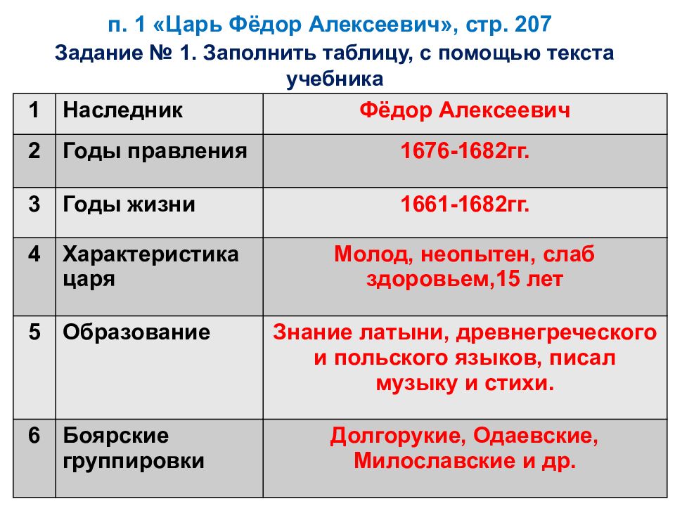 Слайд 2: п. 1 «Царь Фёдор Алексеевич», стр. 207