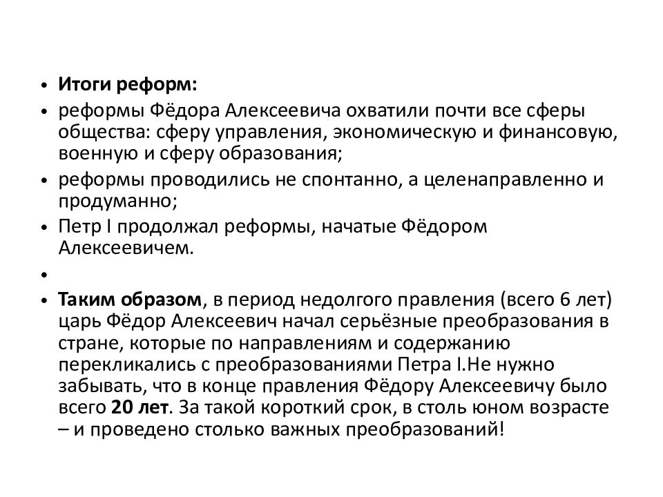 Итоги реформ: реформы Фёдора Алексеевича охватили почти все сферы общества: сферу управления, экономическую и финансовую, военную и сферу образования; реформы проводились не спонтанно, а целенаправленно и продуманно; Петр I продолжал реформы, начатые Фёдором Алексеевичем. Таким образом, в период недолгого правления (всего 6 лет) царь Фёдор Алексеевич начал серьёзные преобразования в стране, которые по направлениям и содержанию перекликались с преобразованиями Петра I.Не нужно забывать, что в конце правления Фёдору Алексеевичу было всего 20 лет. За такой короткий срок, в столь юном возрасте – и проведено столько важных преобразований!