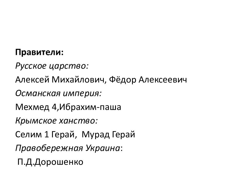Правители: Русское царство: Алексей Михайлович, Фёдор Алексеевич Османская империя: Мехмед 4,Ибрахим-паша Крымское ханство: Селим 1 Герай, Мурад Герай Правобережная Украина : П.Д.Дорошенко