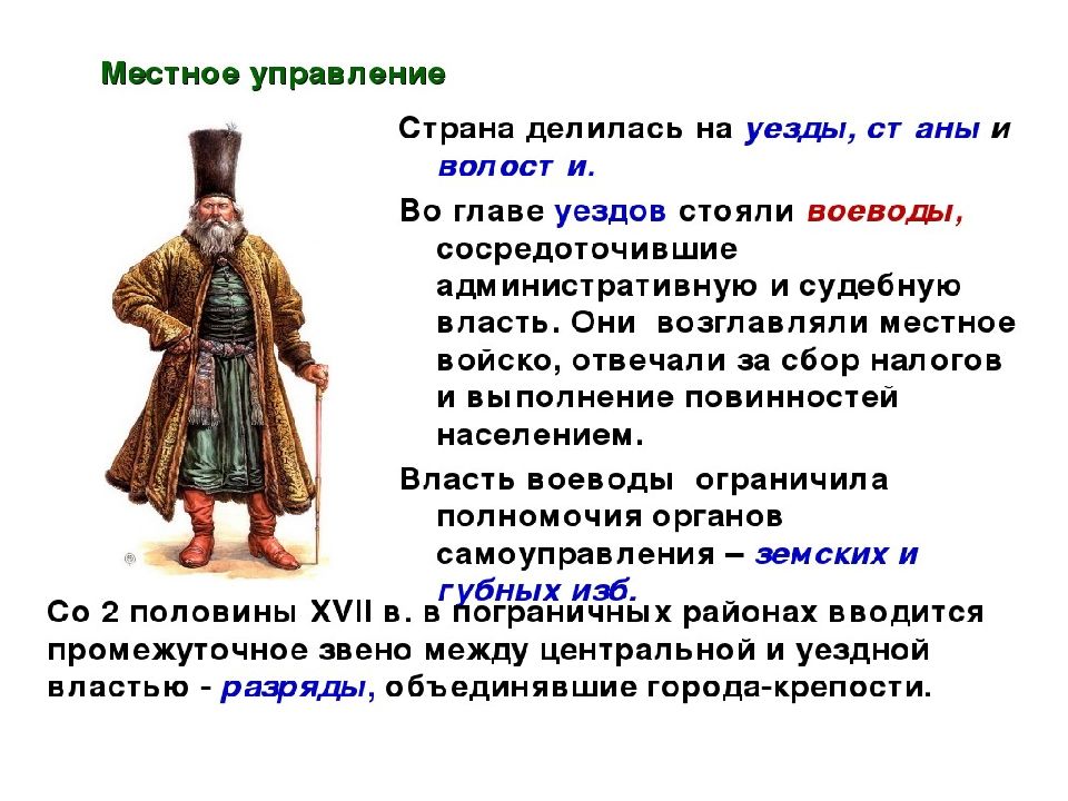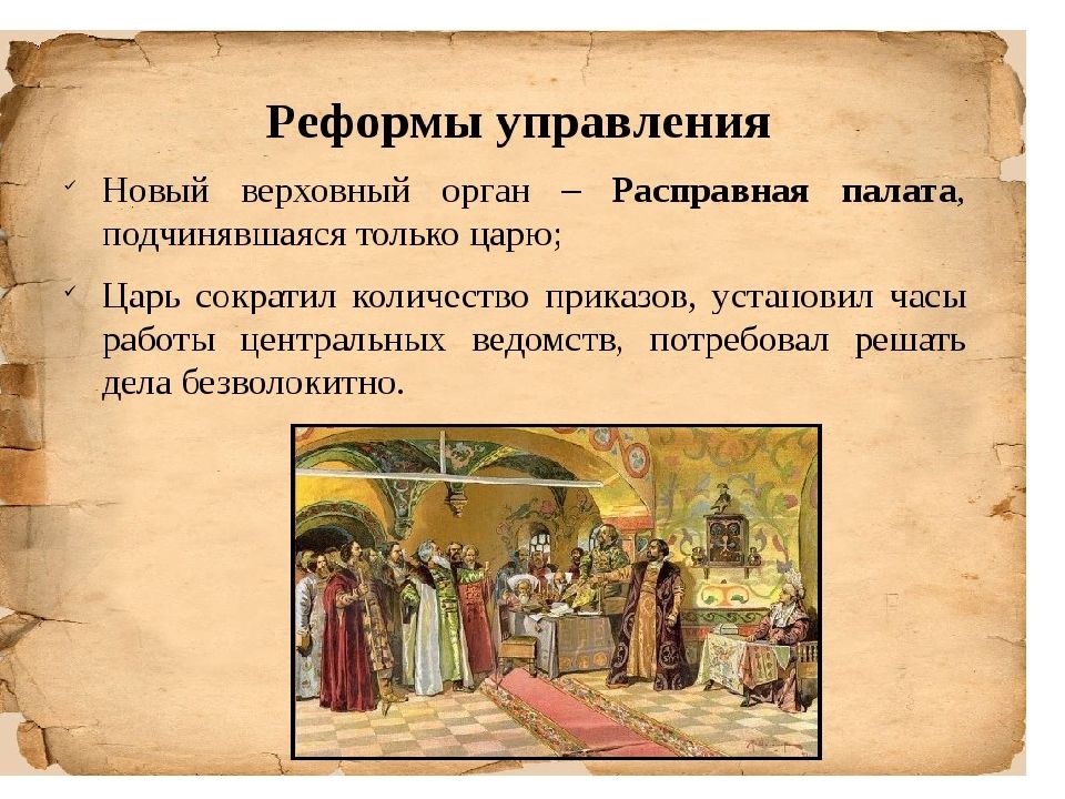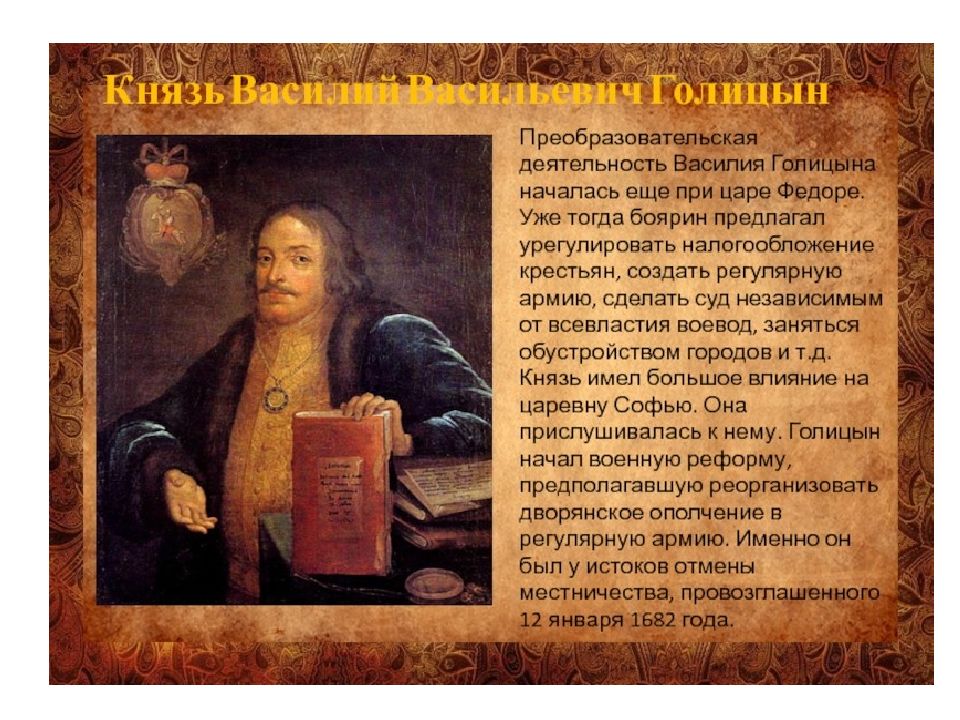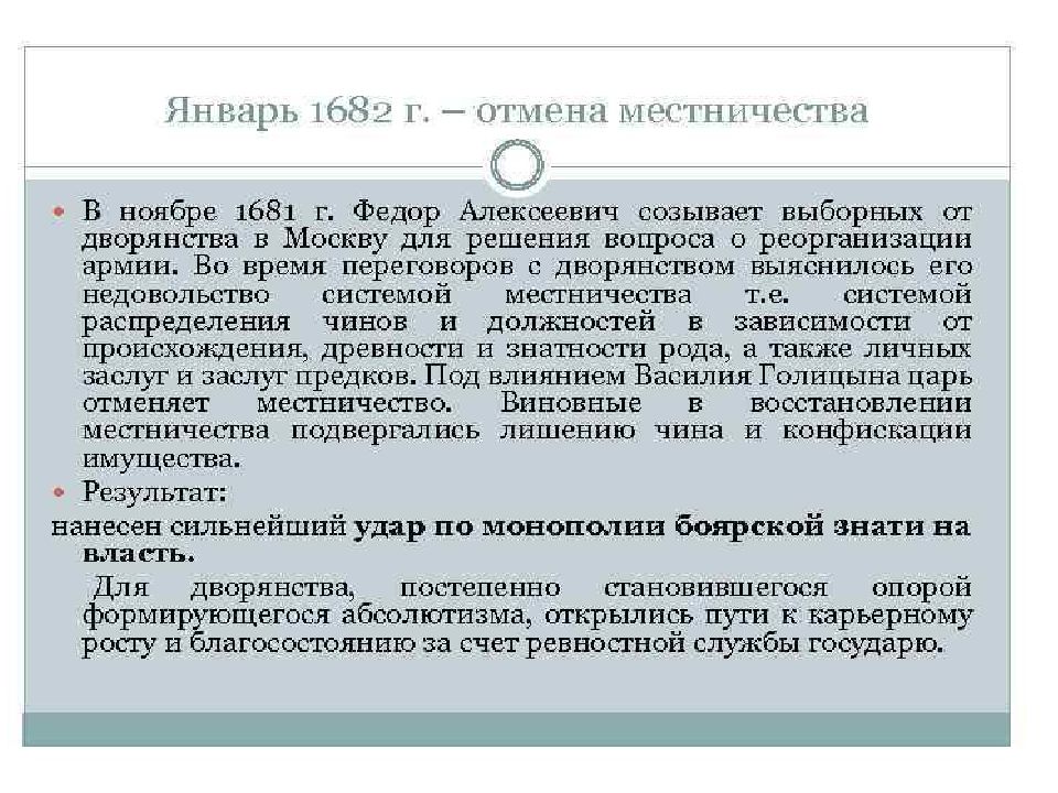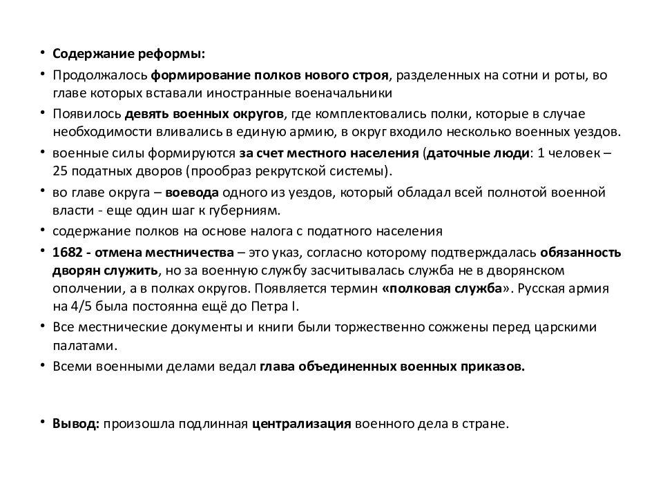 Содержание реформы: Продолжалось формирование полков нового строя, разделенных на сотни и роты, во главе которых вставали иностранные военачальники Появилось девять военных округов, где комплектовались полки, которые в случае необходимости вливались в единую армию, в округ входило несколько военных уездов. военные силы формируются за счет местного населения ( даточные люди : 1 человек – 25 податных дворов (прообраз рекрутской системы). во главе округа – воевода одного из уездов, который обладал всей полнотой военной власти - еще один шаг к губерниям. содержание полков на основе налога с податного населения 1682 - отмена местничества – это указ, согласно которому подтверждалась обязанность дворян служить, но за военную службу засчитывалась служба не в дворянском ополчении, а в полках округов. Появляется термин «полковая служба ». Русская армия на 4/5 была постоянна ещё до Петра I. Все местнические документы и книги были торжественно сожжены перед царскими палатами. Всеми военными делами ведал глава объединенных военных приказов. Вывод: произошла подлинная централизация военного дела в стране.