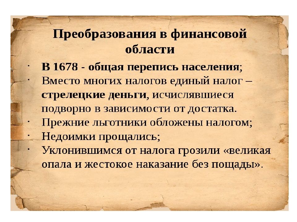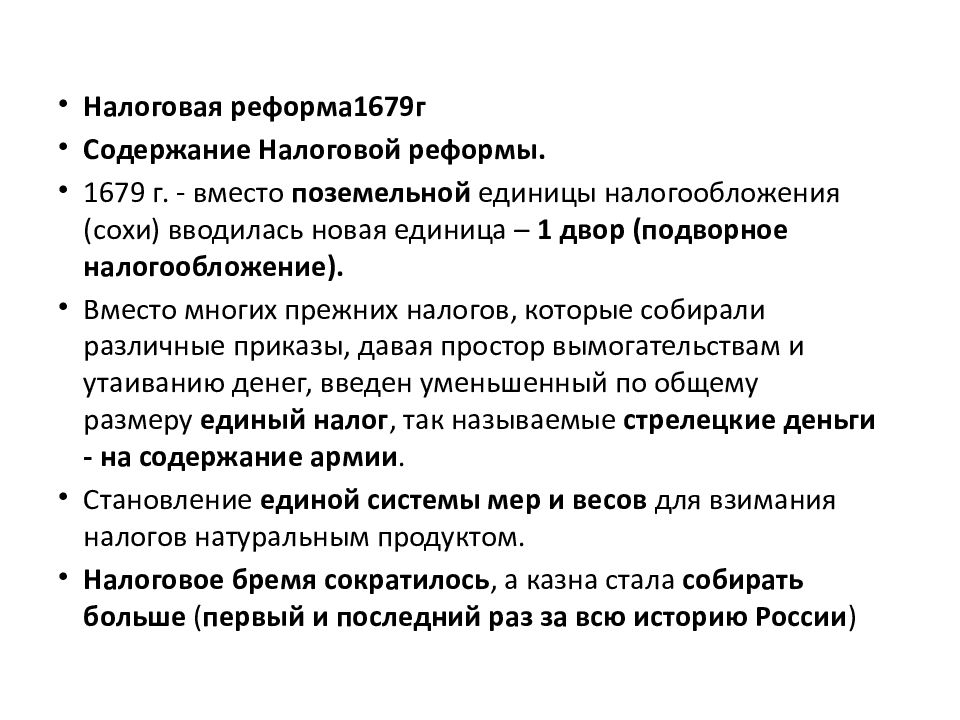 Налоговая реформа1679г Содержание Налоговой реформы. 1679 г. - вместо поземельной единицы налогообложения (сохи) вводилась новая единица – 1 двор (подворное налогообложение). Вместо многих прежних налогов, которые собирали различные приказы, давая простор вымогательствам и утаиванию денег, введен уменьшенный по общему размеру единый налог, так называемые стрелецкие деньги - на содержание армии. Становление единой системы мер и весов для взимания налогов натуральным продуктом. Налоговое бремя сократилось, а казна стала собирать больше ( первый и последний раз за всю историю России )