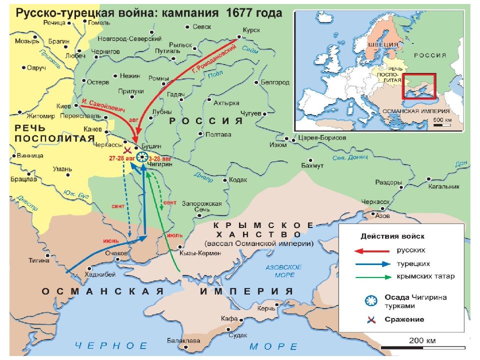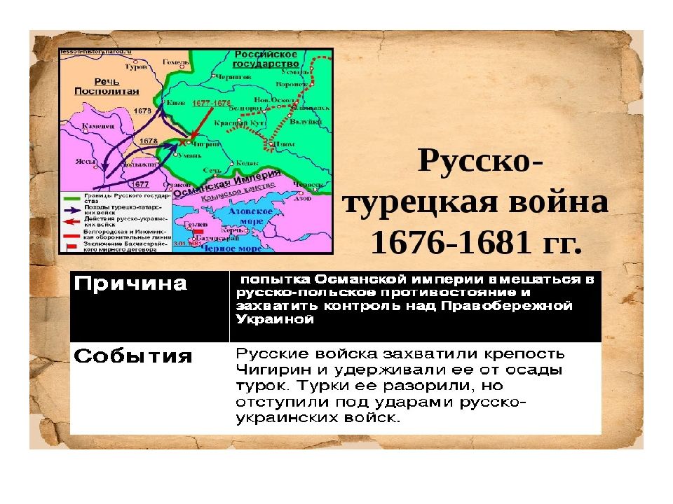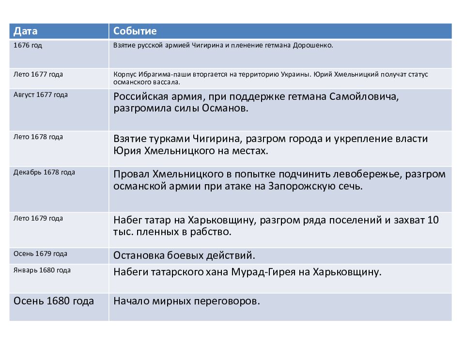 Дата Событие 1676 год Взятие русской армией Чигирина и пленение гетмана Дорошенко. Лето 1677 года Корпус Ибрагима-паши вторгается на территорию Украины. Юрий Хмельницкий получат статус османского вассала. Август 1677 года Российская армия, при поддержке гетмана Самойловича, разгромила силы Османов. Лето 1678 года Взятие турками Чигирина, разгром города и укрепление власти Юрия Хмельницкого на местах. Декабрь 1678 года Провал Хмельницкого в попытке подчинить левобережье, разгром османской армии при атаке на Запорожскую сечь. Лето 1679 года Набег татар на Харьковщину, разгром ряда поселений и захват 10 тыс. пленных в рабство. Осень 1679 года Остановка боевых действий. Январь 1680 года Набеги татарского хана Мурад-Гирея на Харьковщину. Осень 1680 года Начало мирных переговоров.