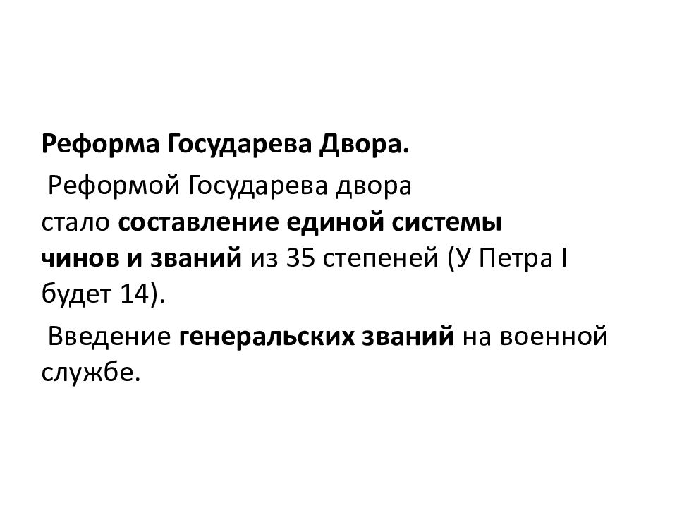 Реформа Государева Двора. Реформой Государева двора стало составление единой системы чинов и званий из 35 степеней (У Петра I будет 14). Введение генеральских званий на военной службе.