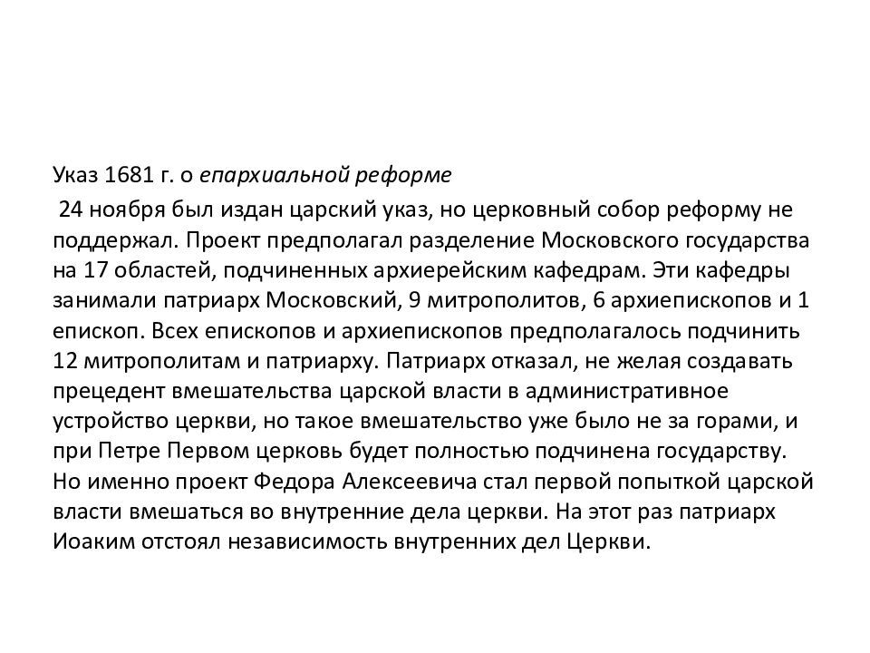 Указ 1681 г. о епархиальной реформе 24 ноября был издан царский указ, но церковный собор реформу не поддержал. Проект предполагал разделение Московского государства на 17 областей, подчиненных архиерейским кафедрам. Эти кафедры занимали патриарх Московский, 9 митрополитов, 6 архиепископов и 1 епископ. Всех епископов и архиепископов предполагалось подчинить 12 митрополитам и патриарху. Патриарх отказал, не желая создавать прецедент вмешательства царской власти в административное устройство церкви, но такое вмешательство уже было не за горами, и при Петре Первом церковь будет полностью подчинена государству. Но именно проект Федора Алексеевича стал первой попыткой царской власти вмешаться во внутренние дела церкви. На этот раз патриарх Иоаким отстоял независимость внутренних дел Церкви.