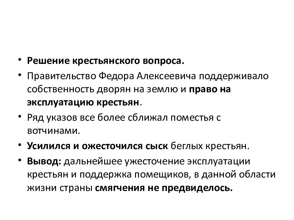 Решение крестьянского вопроса. Правительство Федора Алексеевича поддерживало собственность дворян на землю и право на эксплуатацию крестьян. Ряд указов все более сближал поместья с вотчинами. Усилился и ожесточился сыск беглых крестьян. Вывод: дальнейшее ужесточение эксплуатации крестьян и поддержка помещиков, в данной области жизни страны смягчения не предвиделось.