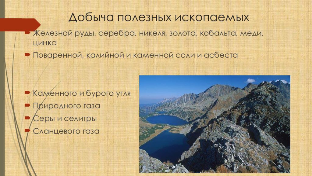 Железной руды, серебра, никеля, золота, кобальта, меди, цинка Поваренной, калийной и каменной соли и асбеста К аменного и бурого угля Природного газа Серы и селитры С ланцевого газа