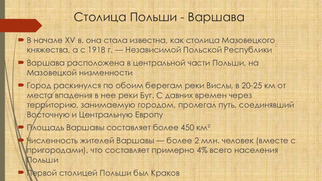 В начале XV в. она стала известна, как столица Мазовецкого княжества, а с 1918 г. — Независимой Польской Республики Варшава расположена в центральной части Польши, на Мазовецкой низменности Город раскинулся по обоим берегам реки Вислы, в 20-25 км от места впадения в нее реки Буг. С давних времен через территорию, занимаемую городом, пролегал путь, соединявший Восточную и Центральную Европу Площадь Варшавы составляет более 450 км² Численность жителей Варшавы — более 2 млн. человек (вместе с пригородами), что составляет примерно 4% всего населения Польши Первой столицей Польши был Краков