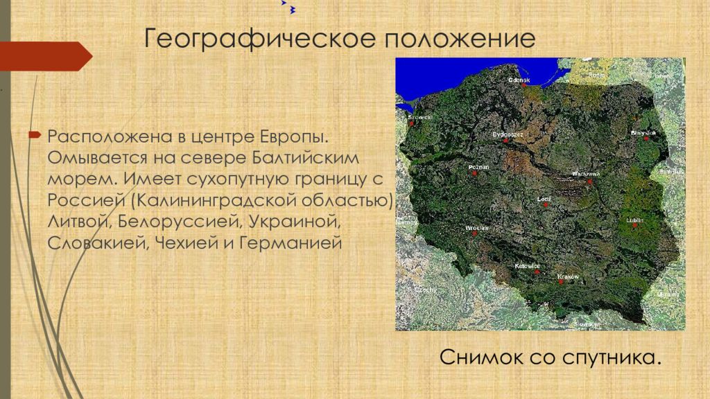 . Расположена в центре Европы. Омывается на севере Балтийским морем. Имеет сухопутную границу с Россией (Калининградской областью), Литвой, Белоруссией, Украиной, Словакией, Чехией и Германией Снимок со спутника.