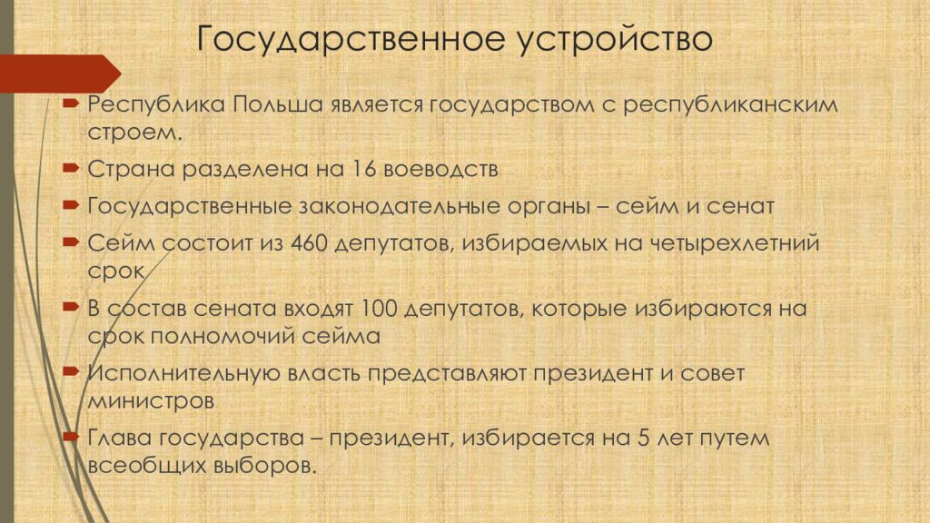 Республика Польша является государством с республиканским строем. Страна разделена на 16 воеводств Государственные законодательные органы – сейм и сенат Сейм состоит из 460 депутатов, избираемых на четырехлетний срок В состав сената входят 100 депутатов, которые избираются на срок полномочий сейма И сполнительную власть представляют президент и совет министров Глава государства – президент, избирается на 5 лет путем всеобщих выборов.