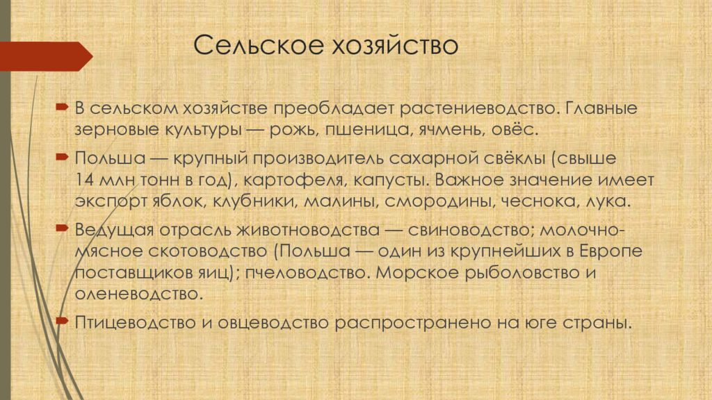 В сельском хозяйстве преобладает растениеводство. Главные зерновые культуры — рожь, пшеница, ячмень, овёс. Польша — крупный производитель сахарной свёклы (свыше 14 млн тонн в год), картофеля, капусты. Важное значение имеет экспорт яблок, клубники, малины, смородины, чеснока, лука. Ведущая отрасль животноводства — свиноводство; молочно-мясное скотоводство (Польша — один из крупнейших в Европе поставщиков яиц); пчеловодство. Морское рыболовство и оленеводство. Птицеводство и овцеводство распространено на юге страны.