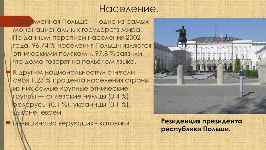 Современная Польша — одно из самых мононациональных государств мира. По данным переписи населения 2002 года, 96,74 % населения Польши являются этническими поляками. 97,8 % заявили, что дома говорят на польском языке. К другим национальностям отнесли себя 1,23 % процента населения страны, из них самые крупные этнические группы — силезские немцы (0,4 %), белорусы (0,1 %), украинцы (0,1 %), цыгане, евреи Большинство верующих - католики Резиденция президента республики Польши.