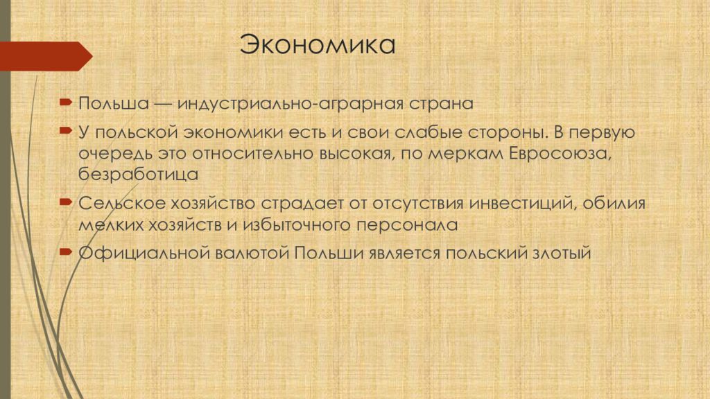 Польша — индустриально-аграрная страна У польской экономики есть и свои слабые стороны. В первую очередь это относительно высокая, по меркам Евросоюза, безработица Сельское хозяйство страдает от отсутствия инвестиций, обилия мелких хозяйств и избыточного персонала Официальной валютой Польши является польский злотый
