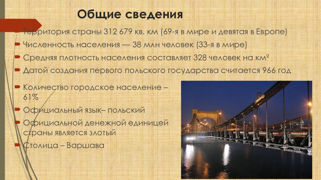 Территория страны 312 679 кв. км (69-я в мире и девятая в Европе) Численность населения — 38 млн человек (33-я в мире) Средняя плотность населения составляет 328 человек на км² Датой создания первого польского государства считается 966 год Количество городское население – 61% Официальный язык– польский Официальной денежной единицей страны является злотый Столица – Варшава