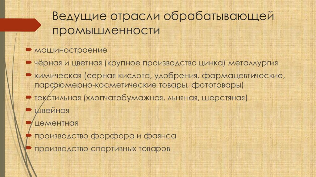 машиностроение чёрная и цветная (крупное производство цинка) металлургия химическая (серная кислота, удобрения, фармацевтические, парфюмерно-косметические товары, фототовары ) текстильная (хлопчатобумажная, льняная, шерстяная ) швейная цементная производство фарфора и фаянса производство спортивных товаров