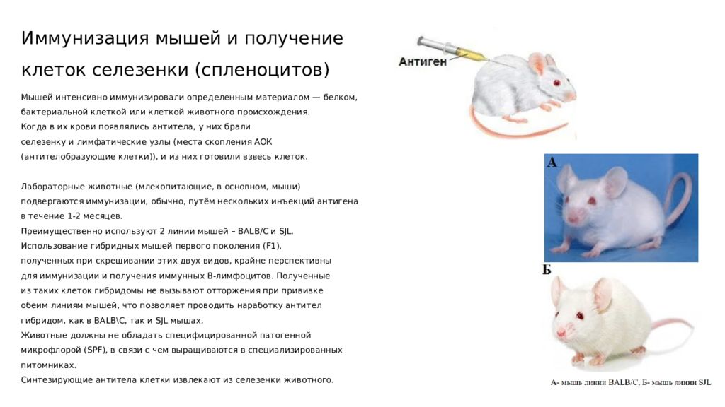 Мышей интенсивно иммунизировали определенным материалом — белком, бактериальной клеткой или клеткой животного происхождения. Когда в их крови появлялись антитела, у них брали селезенку и лимфатические узлы (места скопления АОК ( антителобразующие клетки ) ), и из них готовили взвесь клеток. Лабораторные животные (млекопитающие, в основном, мыши) подвергаются иммунизации, обычно, путём нескольких инъекций антигена в течение 1-2 месяцев. Преимущественно используют 2 линии мышей – BALB/C и SJL. Использование гибридных мышей первого поколения (F1), полученных при скрещивании этих двух видов, крайне перспективны для иммунизации и получения иммунных В-лимфоцитов. Полученные из таких клеток гибридомы не вызывают отторжения при прививке обеим линиям мышей, что позволяет проводить наработку антител гибридом, как в BALB\C, так и SJL мышах. Животные должны не обладать специфицированной патогенной микрофлорой (SPF), в связи с чем выращиваются в специализированных питомниках. Синтезирующие антитела клетки извлекают из селезенки животного.