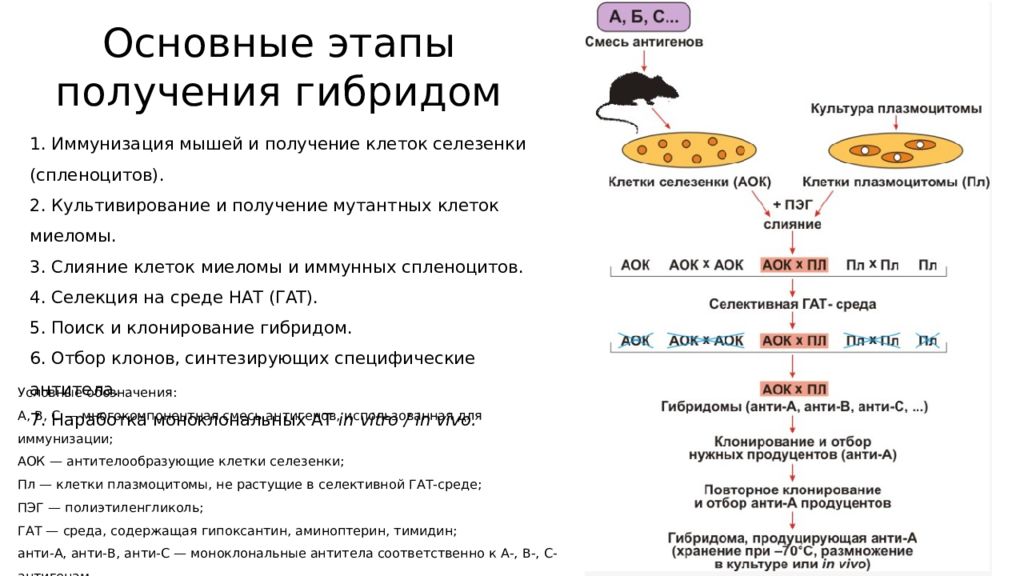 1. Иммунизация мышей и получение клеток селезенки (спленоцитов). 2. Культивирование и получение мутантных клеток миеломы. 3. Слияние клеток миеломы и иммунных спленоцитов. 4. Селекция на среде НАТ (ГAT). 5. Поиск и клонирование гибридом. 6. Отбор клонов, синтезирующих специфические антитела. 7. Наработка моноклональных АТ in vitro / in vivo. Условные обозначения: А, В, С — многокомпонентная смесь антигенов, использованная для иммунизации; АОК — антителообразующие клетки селезенки; Пл — клетки плазмоцитомы, не растущие в селективной ГАТ-среде; ПЭГ — полиэтиленгликоль; ГАТ — среда, содержащая гипоксантин, аминоптерин, тимидин; анти-А, анти-В, анти-С — моноклональные антитела соответственно к А-, В-, С-антигенам.
