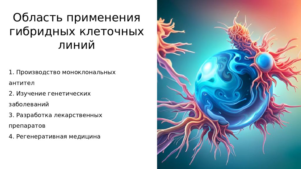 1. Производство моноклональных антител 2. Изучение генетических заболеваний 3. Разработка лекарственных препаратов 4. Регенеративная медицина