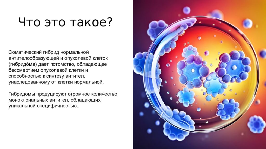 Соматический гибрид нормальной антителообразующей и опухолевой клеток ( гибридóма ) дает потомство, обладающее бессмертием опухолевой клетки и способностью к синтезу антител, унаследованному от клетки нормальной. Гибридомы продуцируют огромное количество моноклональных антител, обладающих уникальной специфичностью.