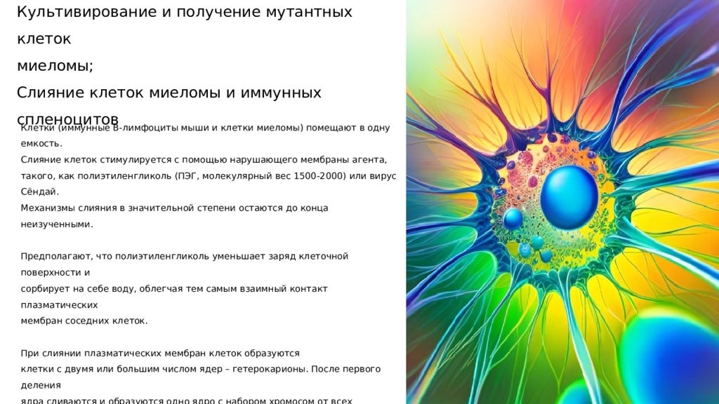Слайд 6: Культивирование и получение мутантных клеток миеломы ; Слияние клеток миеломы и иммунных спленоцитов