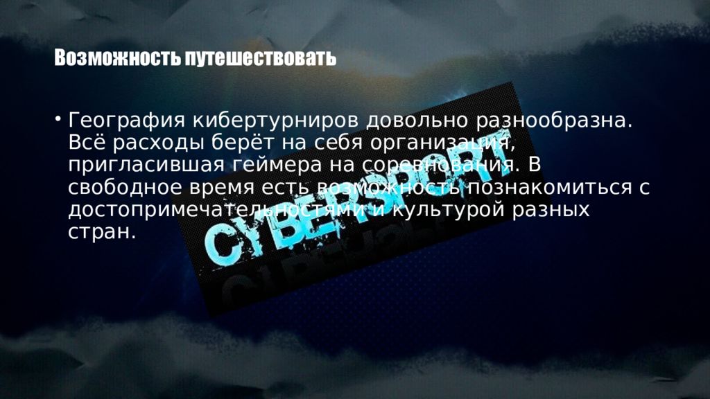 География кибертурниров довольно разнообразна. Всё расходы берёт на себя организация, пригласившая геймера на соревнования. В свободное время есть возможность познакомиться с достопримечательностями и культурой разных стран.