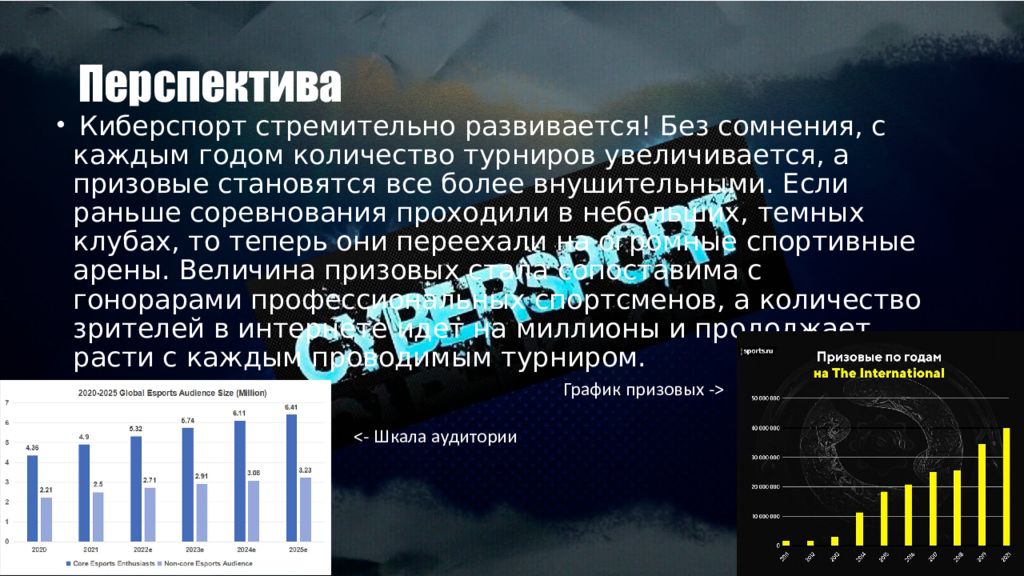 Киберспорт стремительно развивается! Без сомнения, с каждым годом количество турниров увеличивается, а призовые становятся все более внушительными. Если раньше соревнования проходили в небольших, темных клубах, то теперь они переехали на огромные спортивные арены. Величина призовых стала сопоставима с гонорарами профессиональных спортсменов, а количество зрителей в интернете идет на миллионы и продолжает расти с каждым проводимым турниром. <- Шкала аудитории График призовых ->