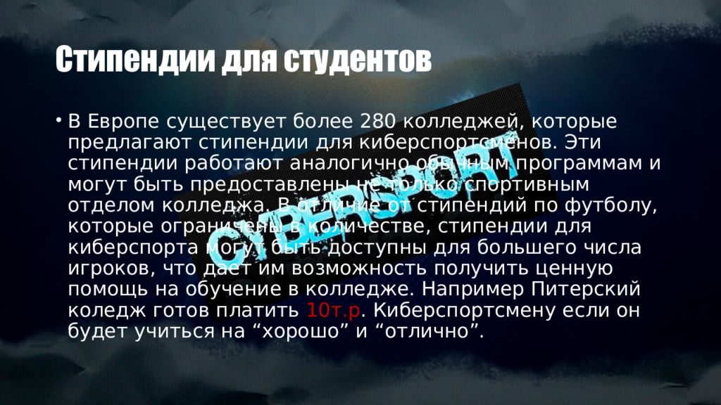 В Европе существует более 280 колледжей, которые предлагают стипендии для киберспортсменов. Эти стипендии работают аналогично обычным программам и могут быть предоставлены не только спортивным отделом колледжа. В отличие от стипендий по футболу, которые ограничены в количестве, стипендии для киберспорта могут быть доступны для большего числа игроков, что дает им возможность получить ценную помощь на обучение в колледже. Например Питерский коледж готов платить 10т.р. Киберспортсмену если он будет учиться на “ хорошо ” и “ отлично ”.